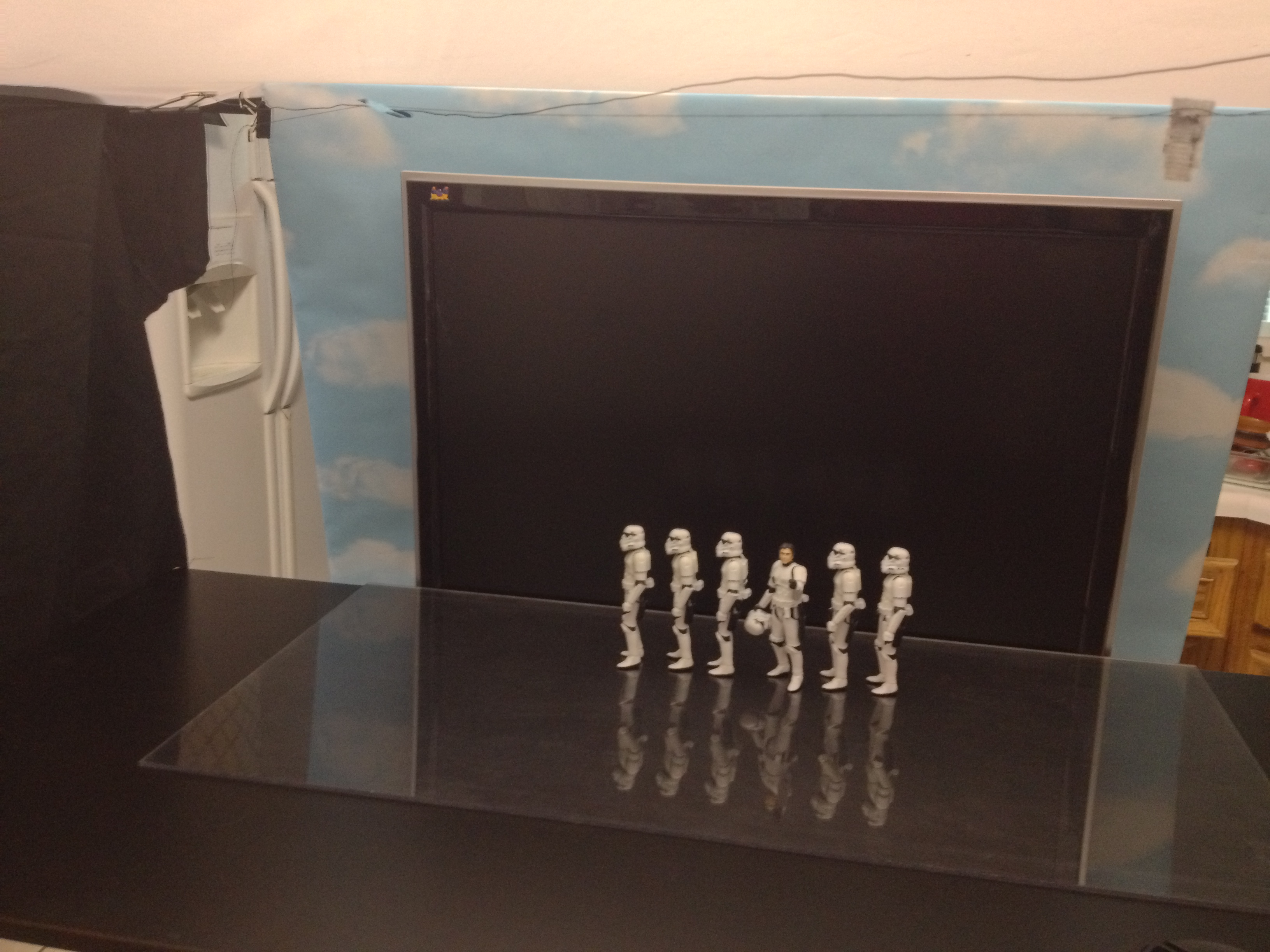 The figures are standing on a sheet of clear acrylic which was placed on the old black shelf that I frequently use as the base of my photo setups. The shelf is elevated by a couple of boxes from the pantry.