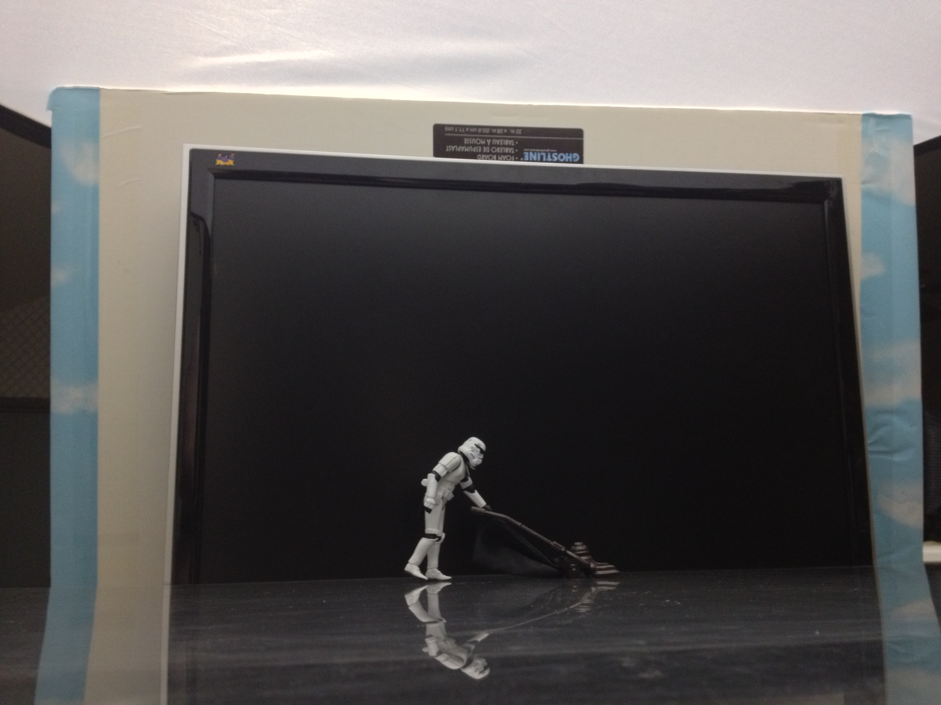 The backdrop is an old computer monitor. The “floor” is a rough sheet of clear acrylic laid across the old black shelf that I often use as a base for my tabletop photography. The stormtrooper is pushing a vintage-style vacuum cleaner designed for a dollhouse.