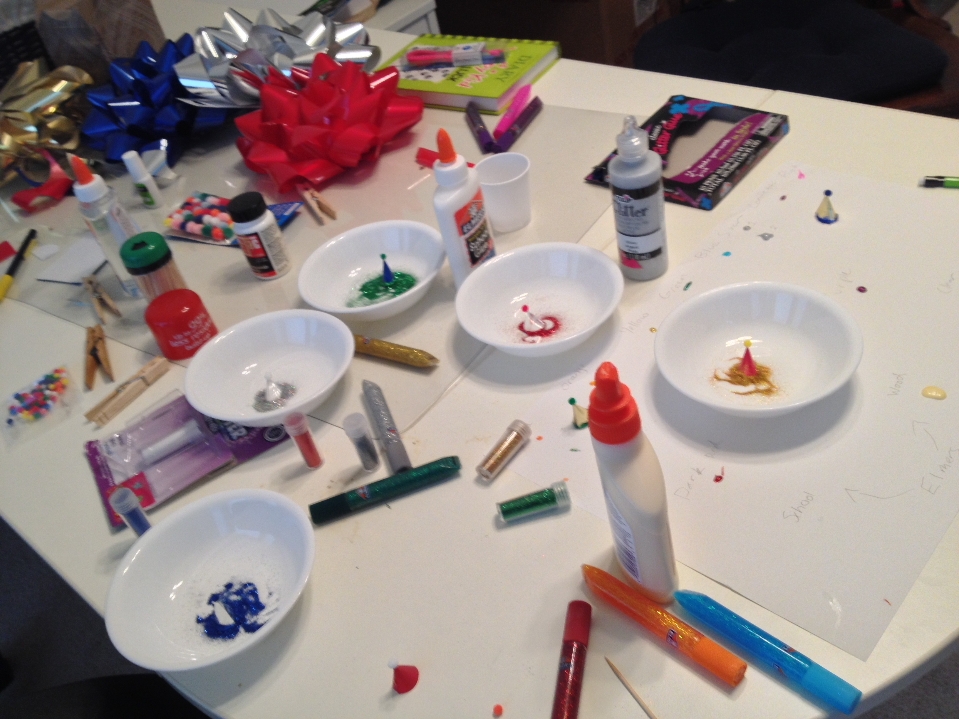 The party hats were much more difficult to set up. My daughter and I actually made them out of large wrapping bows, glitter glue, pom poms, fine glitter, white glue, and clear tape.